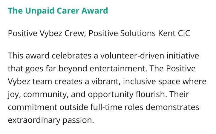 What we hadn’t realised was that our Positive Vybez volunteers had also been shortlisted—and went on to win the 2025 Regional Unpaid Carer Award.